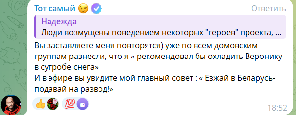 Ведущий телепроекта Дом 2 Андрей Черкасов считает, что у Вероники снесло от Артёма Гавришова "крышу", поэтому она ездит к парню за периметр по ночам и может из-за него вылететь с проекта. Вчера у сладкой парочки снова было свидание, о чем мы рассказывали на шлоке. По мнению Андрея, Вероника для Артёма лишь способ проникнуть назад на проект, но Черкасов против воссоединения голубков под камерами. Андрей допускает, что когда он будет в отпуске, Гавришов может вернуться на дом 2 к Веронике, но жизнь его не будет прежней и иммунитет обольстителю бабушек не дадут. Мнение зрителей о том, что выгонять с проекта Гавришова может только Вероника, Черкасов высмеял. Но в таком случае Гракович может в один прекрасный день загулять и не вернуться на Поляну, а клан Салибековых потеряет одного участника. $IMAGE6$ Ранее мы рассказывали на шлоке о разборках Вероники с дочерью Викторией и Тиграном Салибековым, которым она отказалась помогать, когда выбрала себя и личную жизнь. Какой смысл возвращать Гавришова, если его первым же делом "сольют" на голосовании? Автор: Макс Полянский schlock.ru Новости из дома 2 от гестигра qestigra | | |
