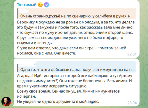 Ведущий телепроекта Дом 2 Андрей Черкасов высказал своё мнение насчёт измен и потасовок в семье Гракович. Андрей Черкасов советует Альберту Граковичу "охладить" Веронику в сугробе, ведь она является виновником семейных бед. По словам ведущего, Вероника просила вернуть Альберта на проект, а сама его бросила. Мы помним, что так и происходило, мы обсуждали на шлоке примирение Альберта и Вероники, когда мужчина только появился на доме 2. Но телебабушке быстро надоело возиться с бывшим мужем. С точки зрения Андрея, Артём Гавришов исчерпал все возможности оставаться на Доме 2 и иммунитетов для него у ведущих не будет. И не факт, что он вернётся на телестройку. Здесь и сам Артём может не захотеть возвращения, ведь на проекте начался период драк и рукоприкладства. Зайдёт на Поляну Гавришов, когда участникам распускать руки запретят? Автор: Макс Полянский schlock.ru Новости из дома 2 от гестигра qestigra | | |