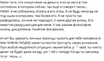 | Последние новости дом 2 на 15 сентября 2025 Данко и Яна Тырлышкина вернулись на Поляну с намерением расстаться. Мамы участников Дома 2 не могут помочь им наладить отношения, по словам психолога Светланы Прель, во время беседы ей удалось вернуть Тырлышкиной надежду и Яна снова начала улыбаться. Данко считает, что любовь поможет ему и Яне понять друг друга. У Данко возникли проблемы в общении с мамой и старые обиды, в основном, из-за Насти Филипповой. Настя поддерживает все тревоги Тырлышкиной и утверждает, что ей самой крупно повезло, когда она рассталась с Даниилом. Однако же Настя прибежала к Кораблеву на проект по первому зову? У Сергея Хорошева и Евгении Дорожкиной конфликт из-за капризов бывшего танцовщика, который не знает, куда деть свою энергию, и требует, чтобы жена следовала его капризам и исполняла желания. Элина Рахимова и Никита Гуранда подхватили "вирус", но уже начали выздоравливать и в паре потепление. Волшебству быть? У некоторых участников Дома 2, мужчин, есть секреты от своих дам, поэтому на Лобном обсуждалась эта важная тема. Психолог Светлана Прель высказала своё мнение по этому поводу, узнаем о нём через неделю. Если люди живут вместе долгое время, никаких секретов не остается? Или, наоборот, появляются? Катя Квашникова и Игорь Григорьев демонстрируют идиллию, но за кадром Квашникова ссорится с подписчиками, которые заметили, что она "зазвездилась" и меняется в худшую сторону - обижает новичков. Катя призналась, что ей, мягко говоря, безразлично, что думают о ней зрители Дома 2. Тигран Салибеков учит Дмитрия Гачмина и Ивана Китаева играть в нарды - растит новое поколение топчиков Дома 2. Наверное, проект покинула не только Кристина Абакумова, но и Регина Шаймухаметова ушла домой? Последние новости дом 2.ru на сегодня 15.09.2025 - Саша Черно страдает из-за сожительства с бывшим мужем Иосифом Оганесяном, который говорит ребёнку про неё гадости, а ей самой постоянно желает смерти. При этом Иосиф должен бывшей супруге 300 тысяч рублей и оставил её без заработка, так как устроился на работу, а она сидит дома с ребёнком. Вот не слушала Чернявская 3 года назад подписчиков, советующих ей забрать сына и прекратить общение с Оганесяном? Автор: Макс Полянский schlock.ru Читай новости из дома 2 на сайте гестигра дом 2 Новости из дома 2 от гестигра qestigra | | |